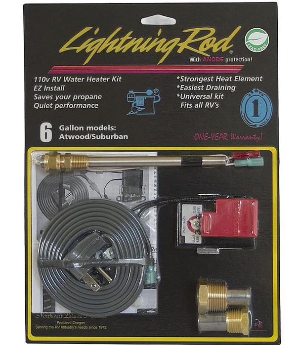 6 Gallon RV Water Heater Lightning Rod. Add 110 volt power to RV water heaters. The Lightning Rod is a great add-on product.